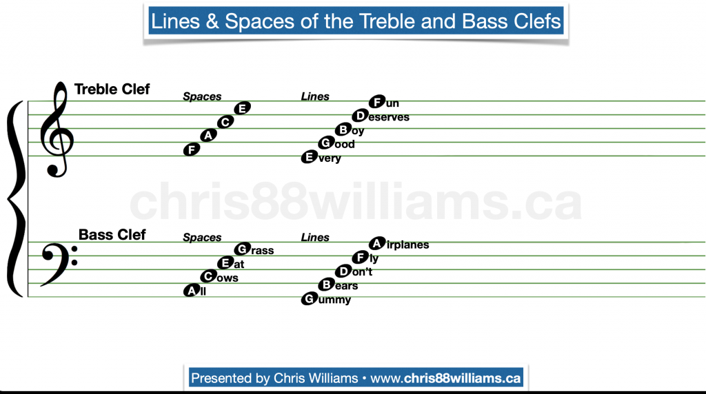 This is a handy “cheat sheet” of the lines and spaces of the treble and bass clefs. Free download if you like.
